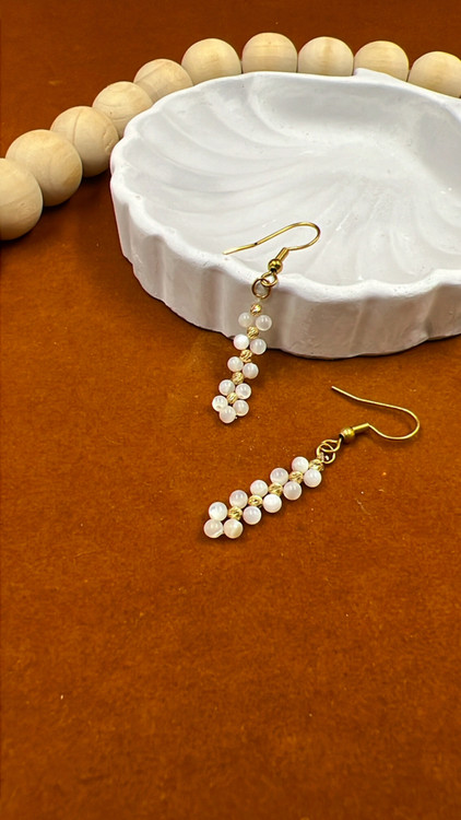 جنس پایه گوشواره از استیل رنگ ثابت و مهره ها از جنس سنگ وگوی های به کار رفته در این گوشواره از گوی های ۳۰ سوتی طلا میباشد